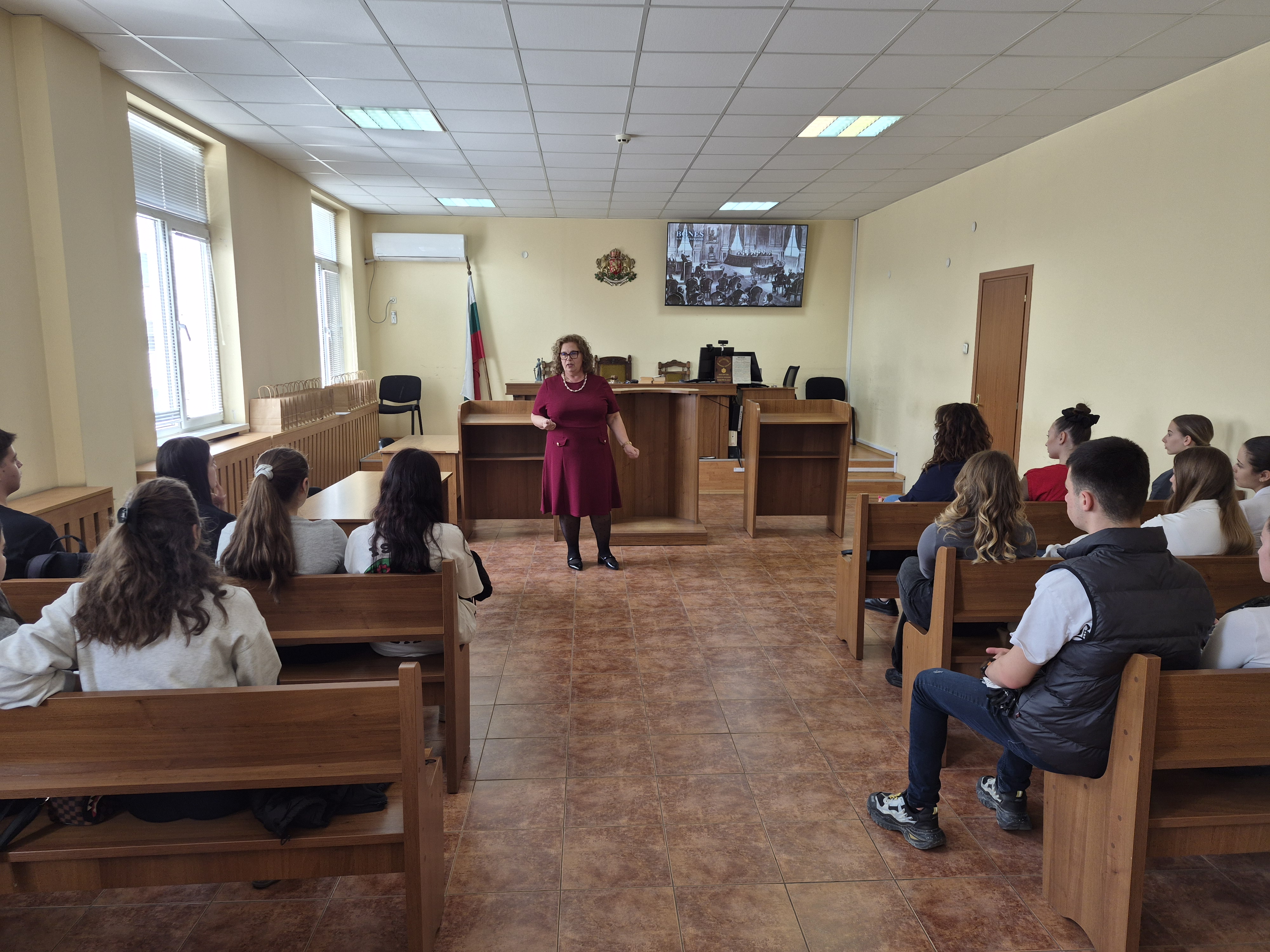 Точно във връзка с такъв конфликт между ученици, беше и поставения пред децата казус, който те разиграха в симулативен съдебен процес. Всички роли бяха заети от ученици – съдия, съдебни заседатели, прокурор, адвокати, пострадал, свидетели, подсъдим. По време на процеса, децата бяха насочвани и подпомагани от съдия д-р Кръстева. Накрая, те трябваше да решат, каква присъда да постановят и какво наказание да наложат. По този начин сами усетиха сложността и отговорността на работата на магистратите.